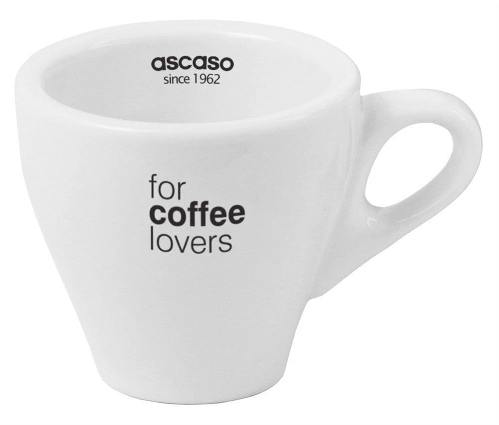 This is a nice set of ceramic espresso cups with the Ascaso logo and slogan. This is set of 6 cups and saucers and is a traditional cappuccino tulip shape and size.