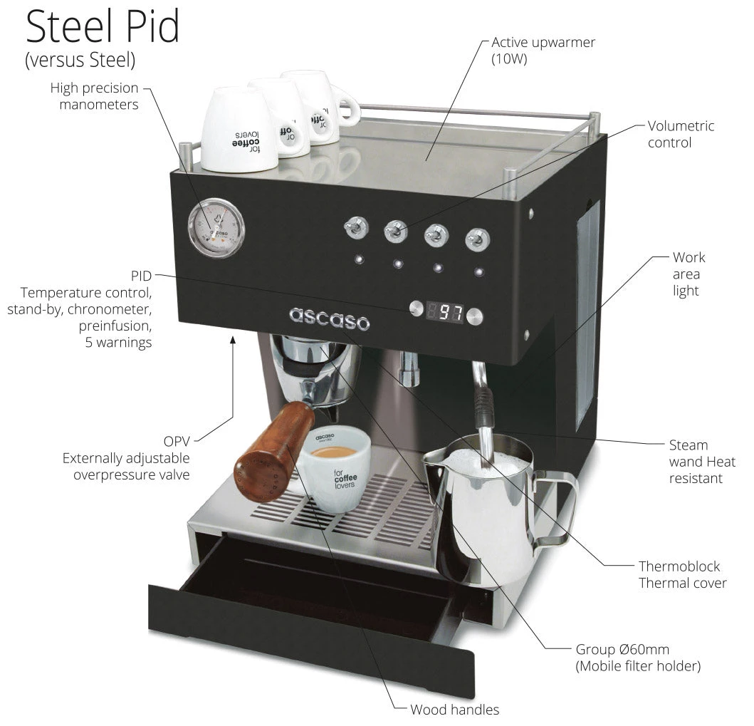The term ‘Professional’ used by Ascaso signifies that the grouphead and portafilter accommodate 58mm diameter sized filter baskets like that found on commercial machines. The Ascaso Steel Uno Professional w/ PID V4 offers a marvelous combination of style and performance, allowing you to create quality espressos, cappuccinos and lattes at home. The built-in PID (Proportional, Integral, Derivative) controller allows you to brew espresso at the perfect temperature every time. The solid specification of this machine includes a commercial-sized filter holder in wood, 68 oz water tank and 3-way solenoid valve. Plus, the stainless steel finish (with black or white) and cool blue LED’s will make Uno Professional w/ PID the star of your kitchen.