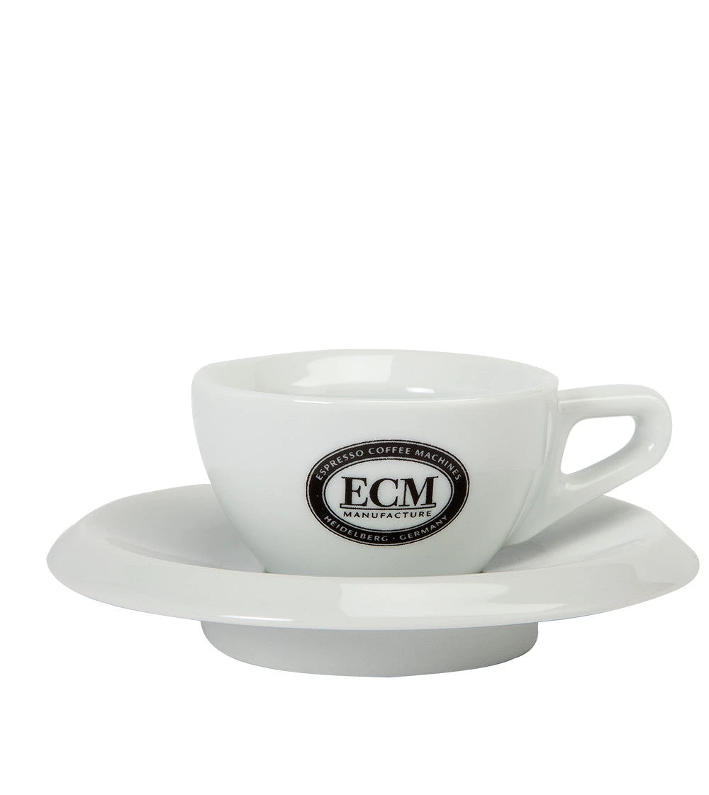 This is a nice set of ceramic espresso cups with the ECM logo and slogan. This is set of 2 cups and saucers.