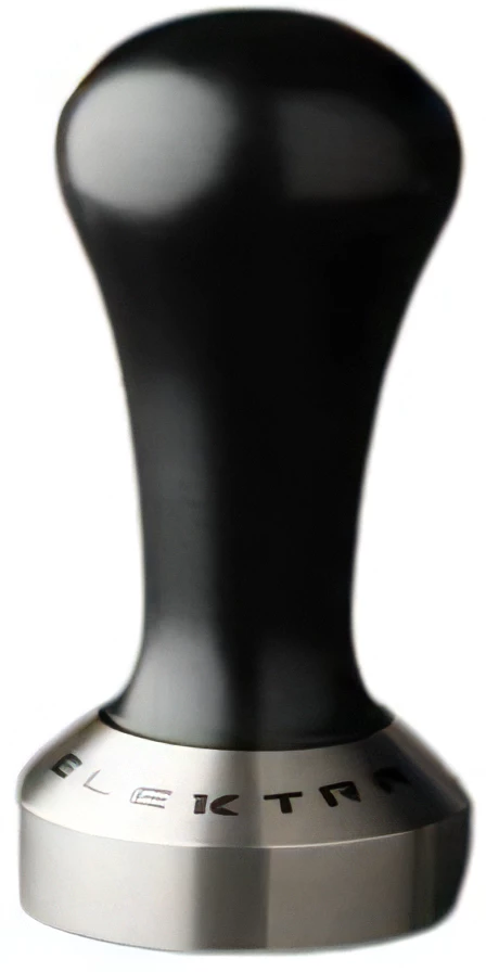 Elektra 49 mm flat stainless steel tamper with black painted wooden handle.