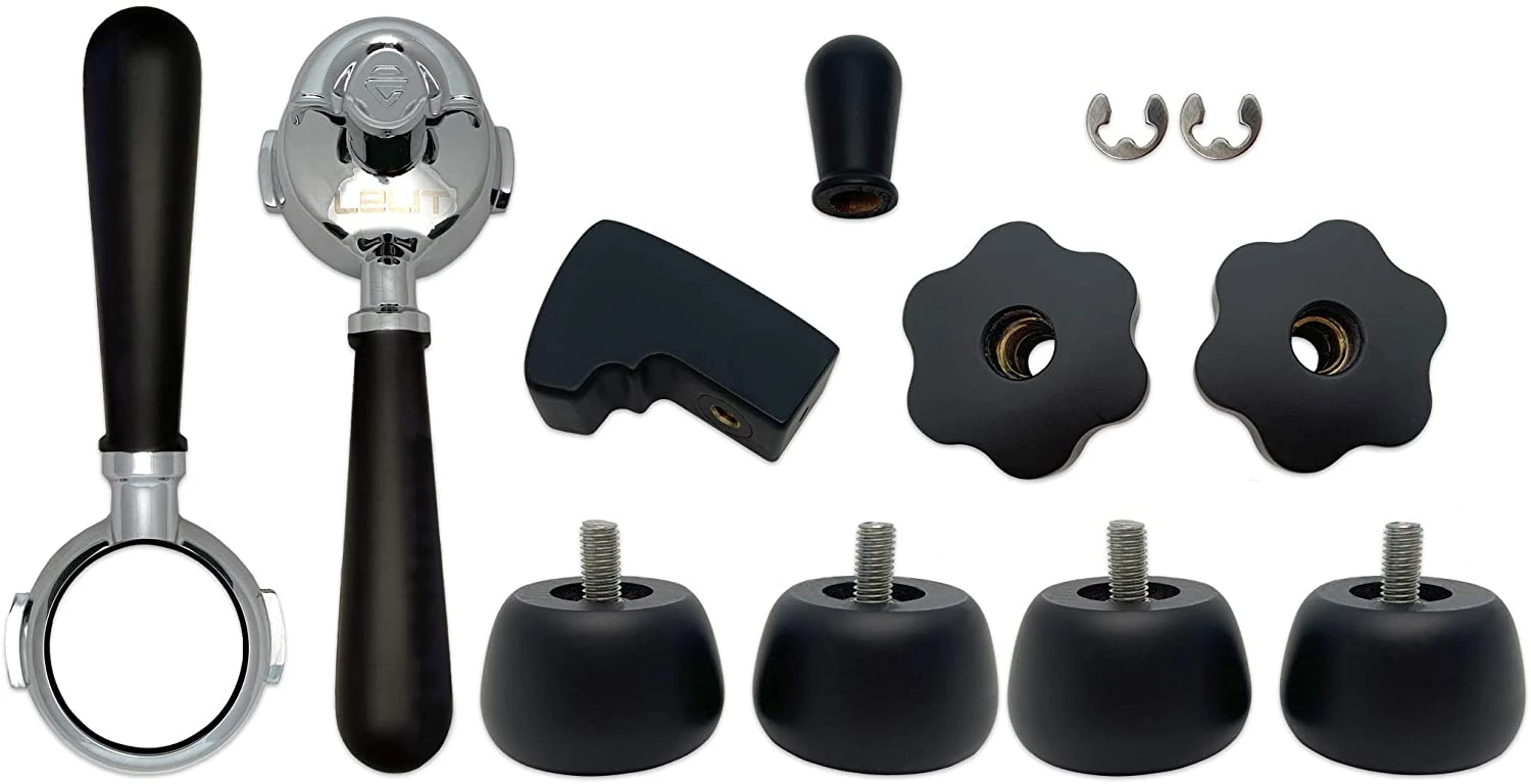 The kit consists of two knobs for steam and hot water wands, a knob for the extraction lever, a paddle, and four feet. Also included are two portafilters with black walnut wooden handles: a bottomless version and a 2-way version with a LELIT58 Coffee Slide spout. The kit comes with all the components needed for assembly (filters not included).