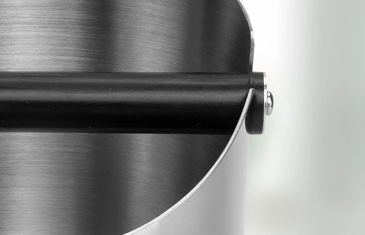 High-quality knockbox in brushed stainless steel for knocking out the used espresso pucks.