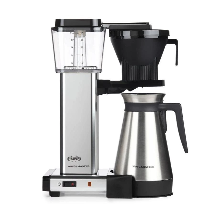 The Moccamaster KBGT model features a thermal carafe and an automatic drip-stop brew-basket that stops the flow of coffee if the carafe is pulled away. The KBGT brews a full 40oz pot of coffee in six minutes. The thermal carafe will keep your coffee hot up to an hour. To keep coffee hot for longer or travelling with your carafe, switch to the included Travel Lid.