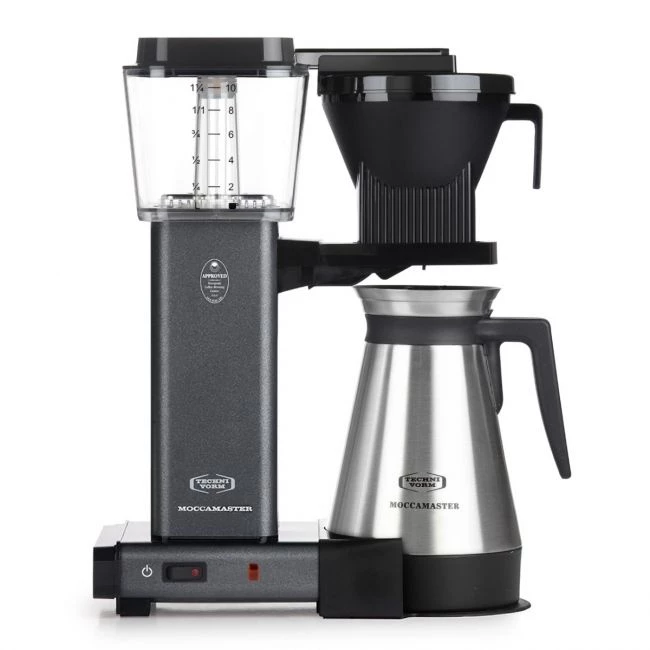 The Moccamaster KBGT model features a thermal carafe and an automatic drip-stop brew-basket that stops the flow of coffee if the carafe is pulled away. The KBGT brews a full 40oz pot of coffee in six minutes. The thermal carafe will keep your coffee hot up to an hour. To keep coffee hot for longer or travelling with your carafe, switch to the included Travel Lid.